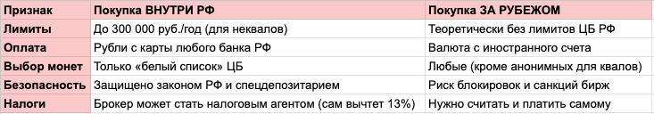 Главные отличия покупки криптовалюты «внутри» РФ от покупки «снаружи» - в табличке ниже: